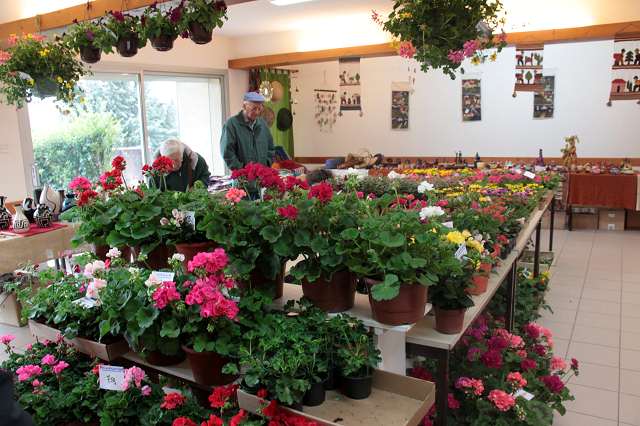 Marché de printemps de Partage sans Frontières, 18ème du nom, à Montmeyran, stand de vente, fleurs et artisanats